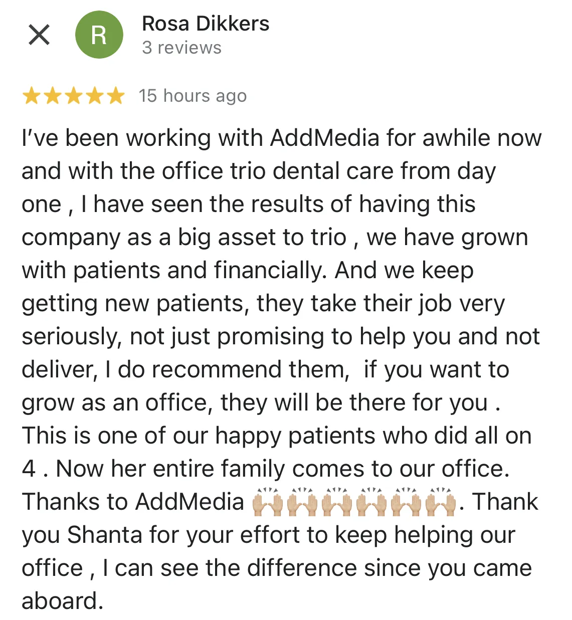 Shanta and May have been amazing to work with!! The entire journey with AddMedia has been spectacular to say the least. Our patient base has quadrupled in the last 2 months, I’ve closed over 200k in one week!! Thank you AddMedia 🙌10 out of 10 ⭐️⭐️⭐️⭐️⭐️⭐️⭐️⭐️⭐️⭐️"